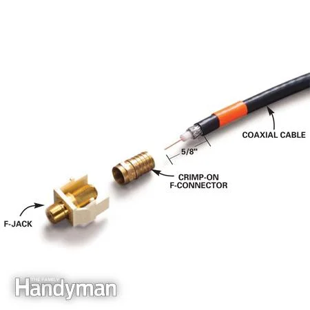 Use the stripper tool to take off about 5/8-in off the end, then assemble these parts onto the end of the cable. After pushing on the f-connector tightly, use the crimping tool to crimp it on. Then snip off the copper wire until it's 1/8-in past the f-connector.