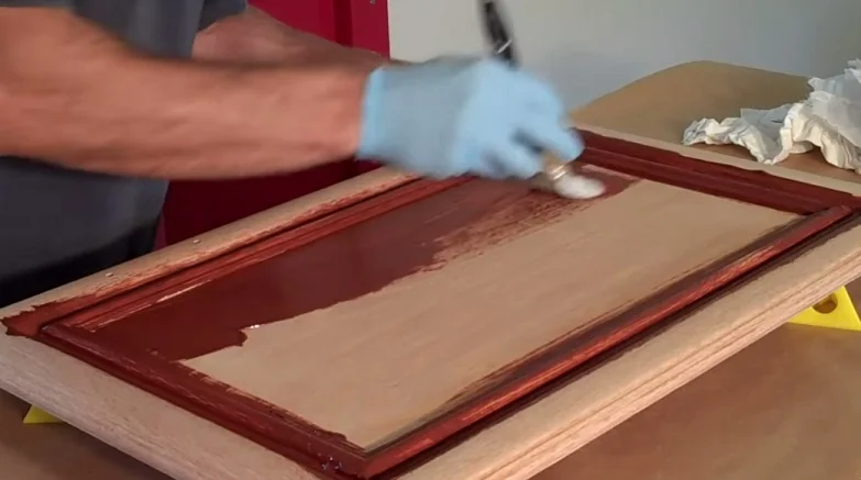 Apply two coats of shellac to the door face. Use a tack cloth to clean the doors between coats. After the shellac dries, apply two coats of water-based polyurethane and sand.