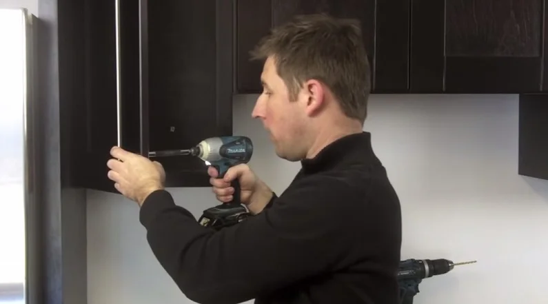 If you're going to add new hardware, a few things need to be done. Fill in the old hardware holes, paint the accent lines, attach hinges, hang the doors, then drill holes for the new handles.